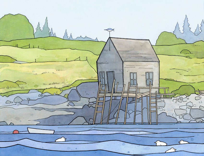 A new watercolor and ink illustration of a little boathouse on Vinalhaven island off the coast of Maine. We saw this charming little boathouse on a morning ferry ride out to the island. I loved the little fish weathervane and the stilts to accommodate the large tide shifts of the area.